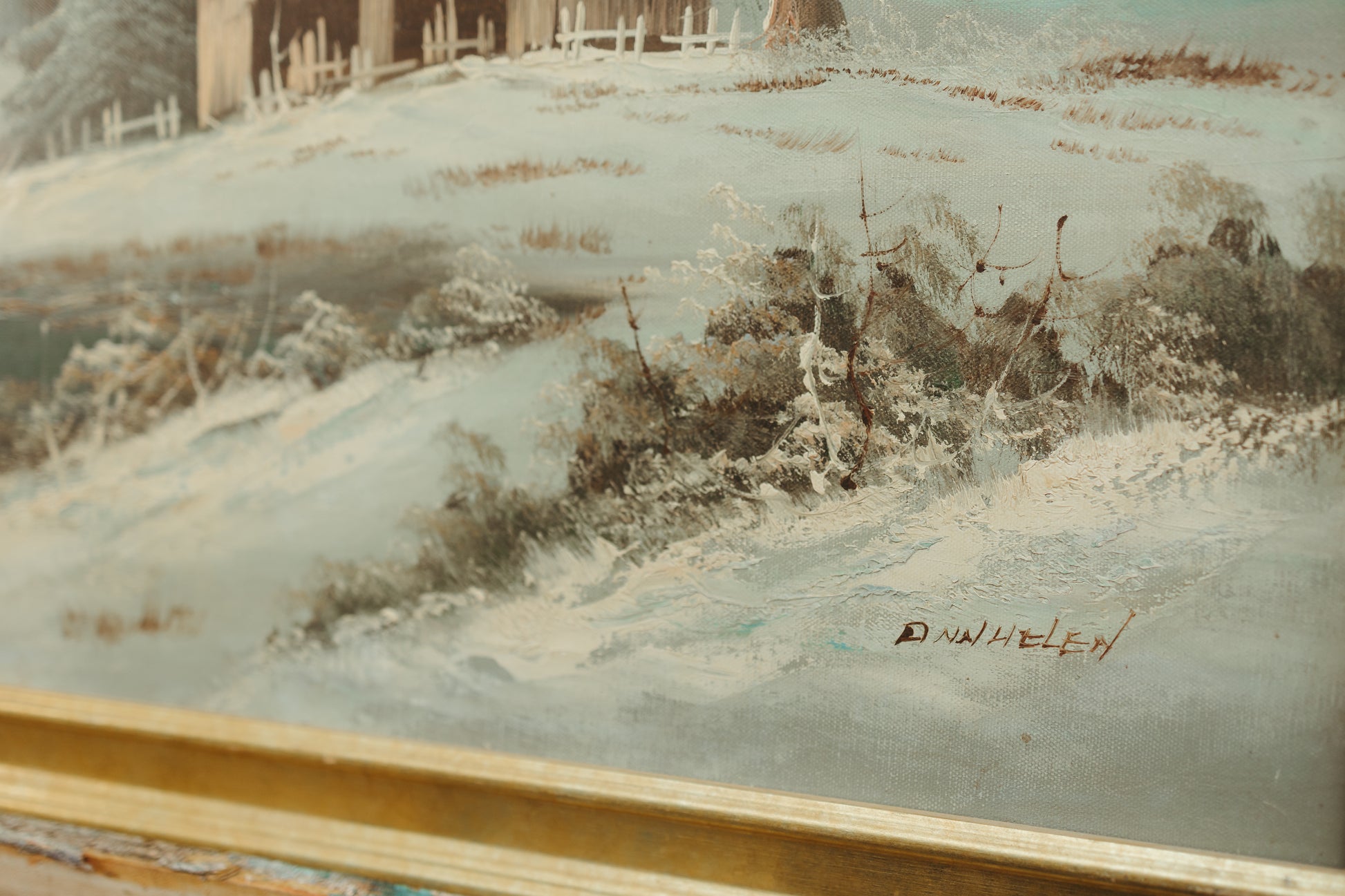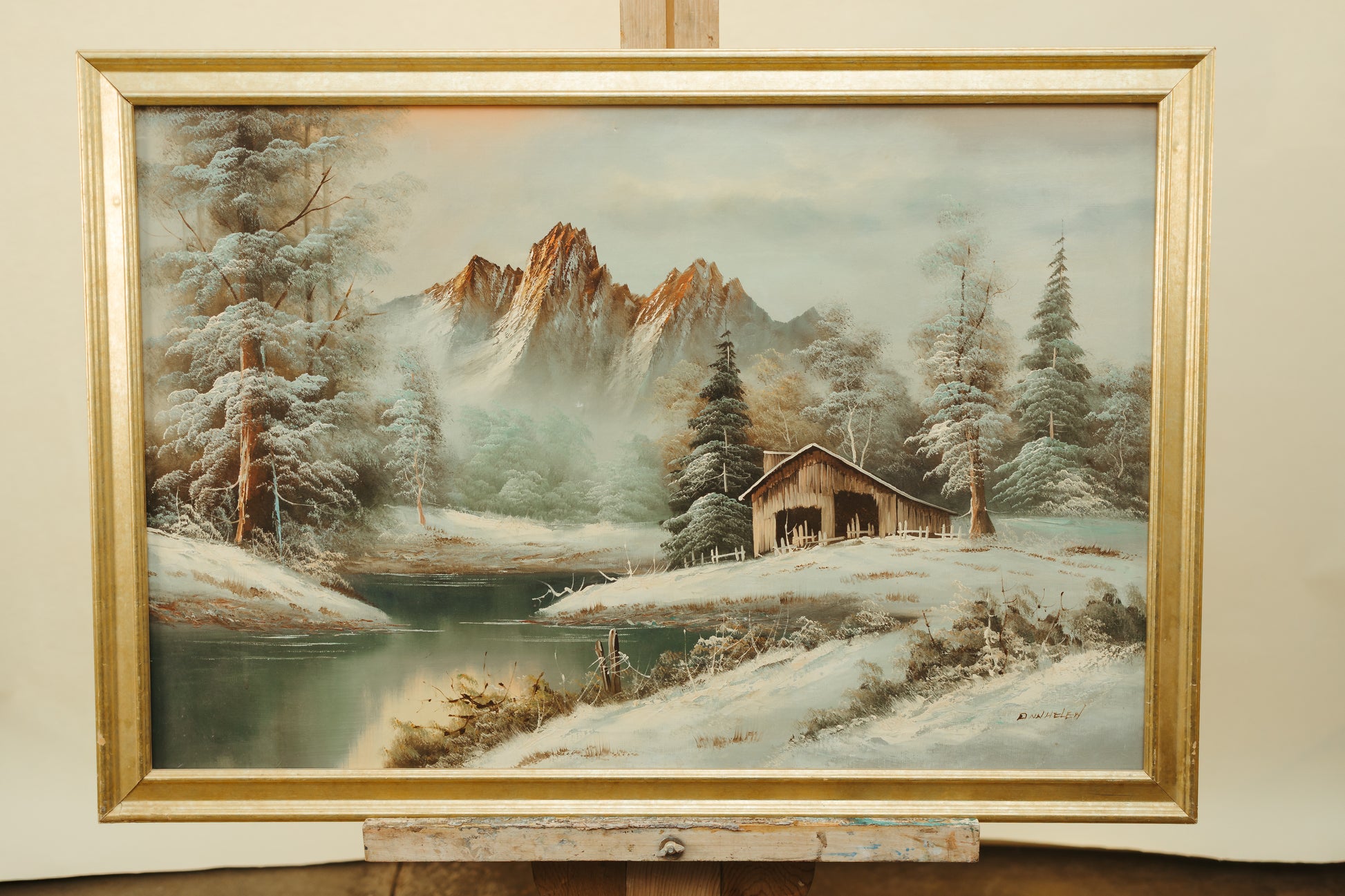 Vintage Winter Landscape Oil Painting – Cabin & Mountain Scene