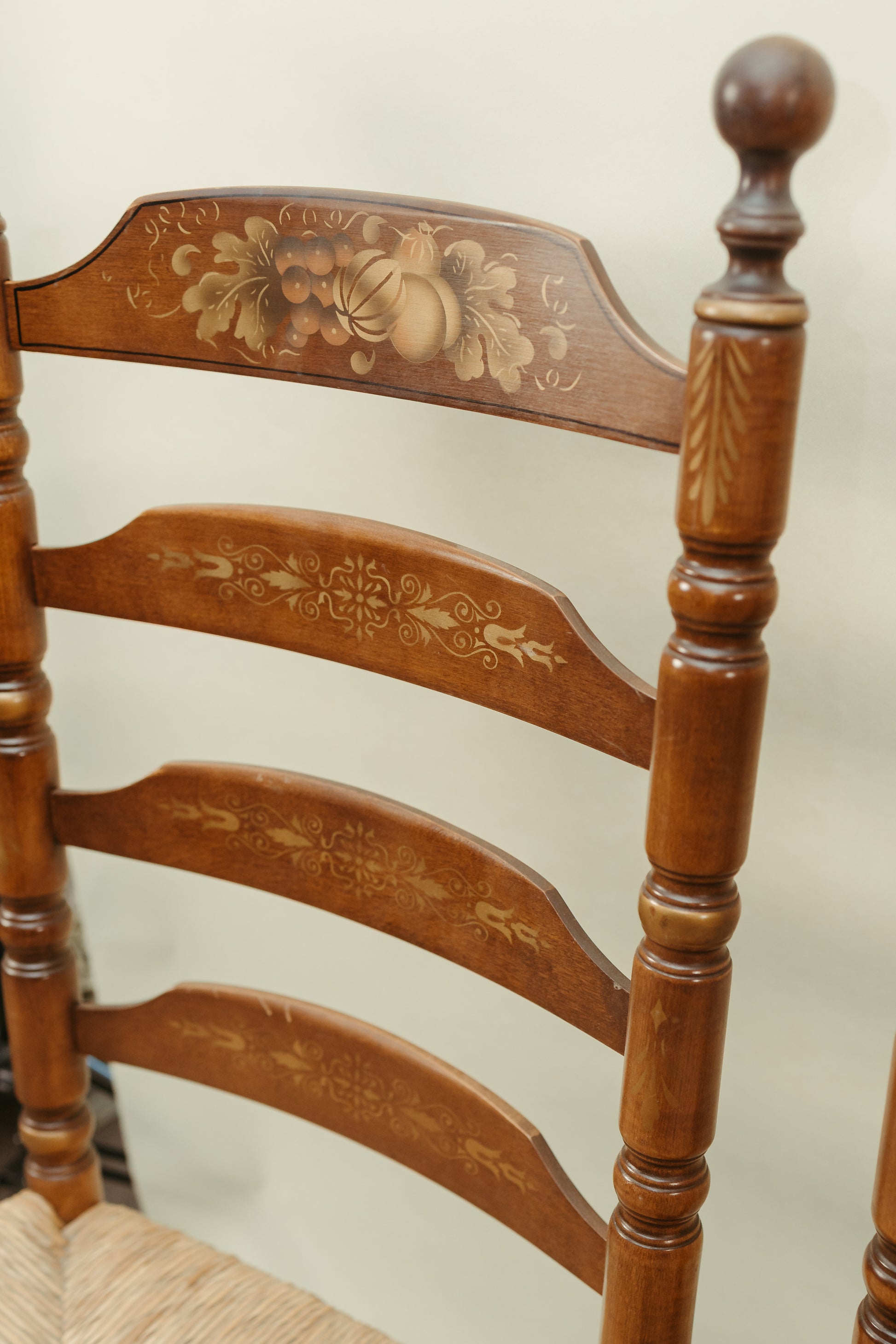 Warm maple tones and hand-painted detailing showcase the timeless craftsmanship Hitchcock Furniture is known for. The rush seats have aged gracefully, adding texture and character while remaining sturdy and comfortable.