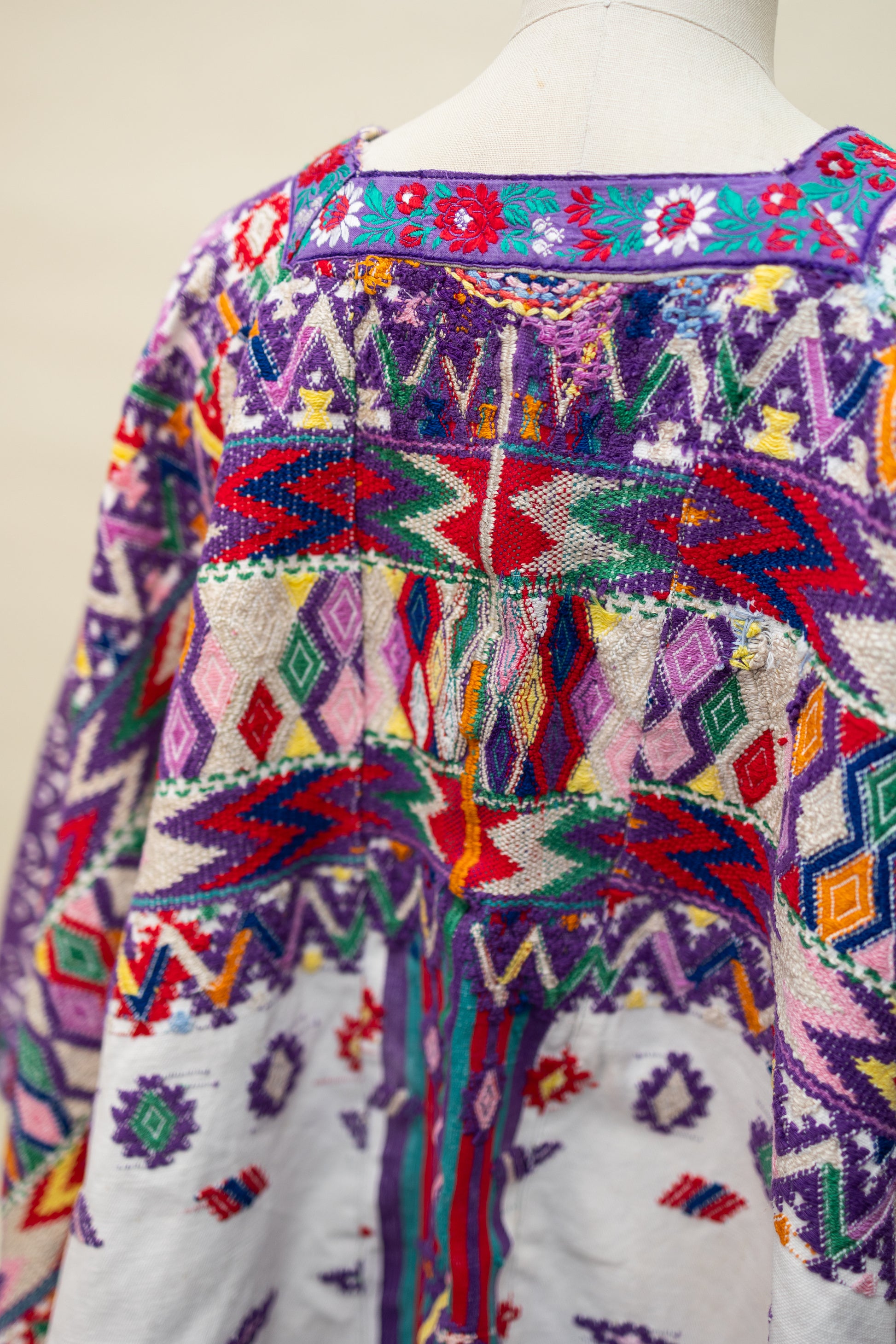 A breathtaking traditional huipil featuring vibrant, densely hand-embroidered geometric and floral motifs in saturated purples, reds, greens, blues, and pinks. The front and back showcase intricate zig-zag and diamond patterns, with floral embroidery framing the neckline. The body transitions into a lighter woven base with scattered symbolic motifs in bright threadwork. Voluminous sleeves and a flowing structure give it a dramatic, artistic drape.