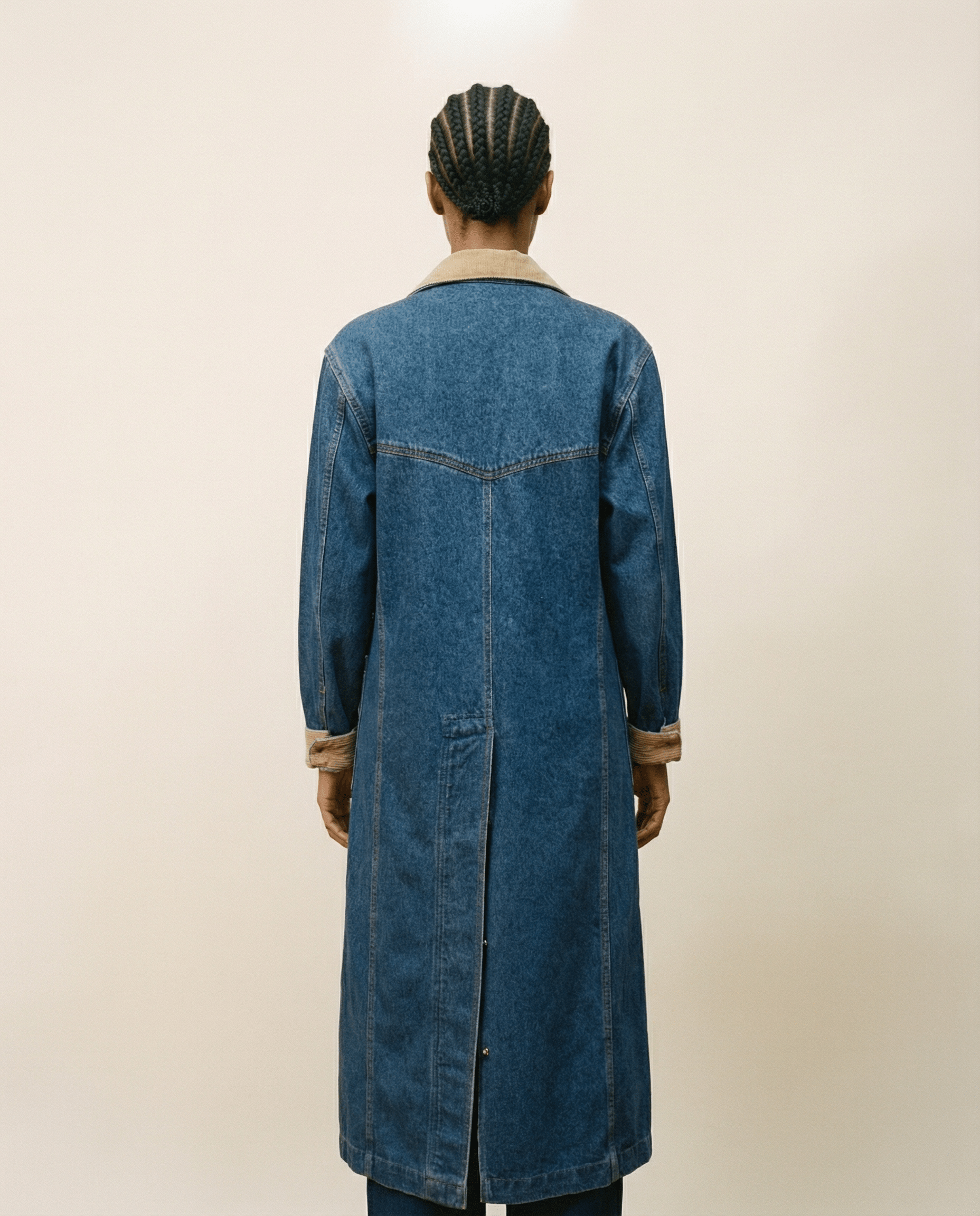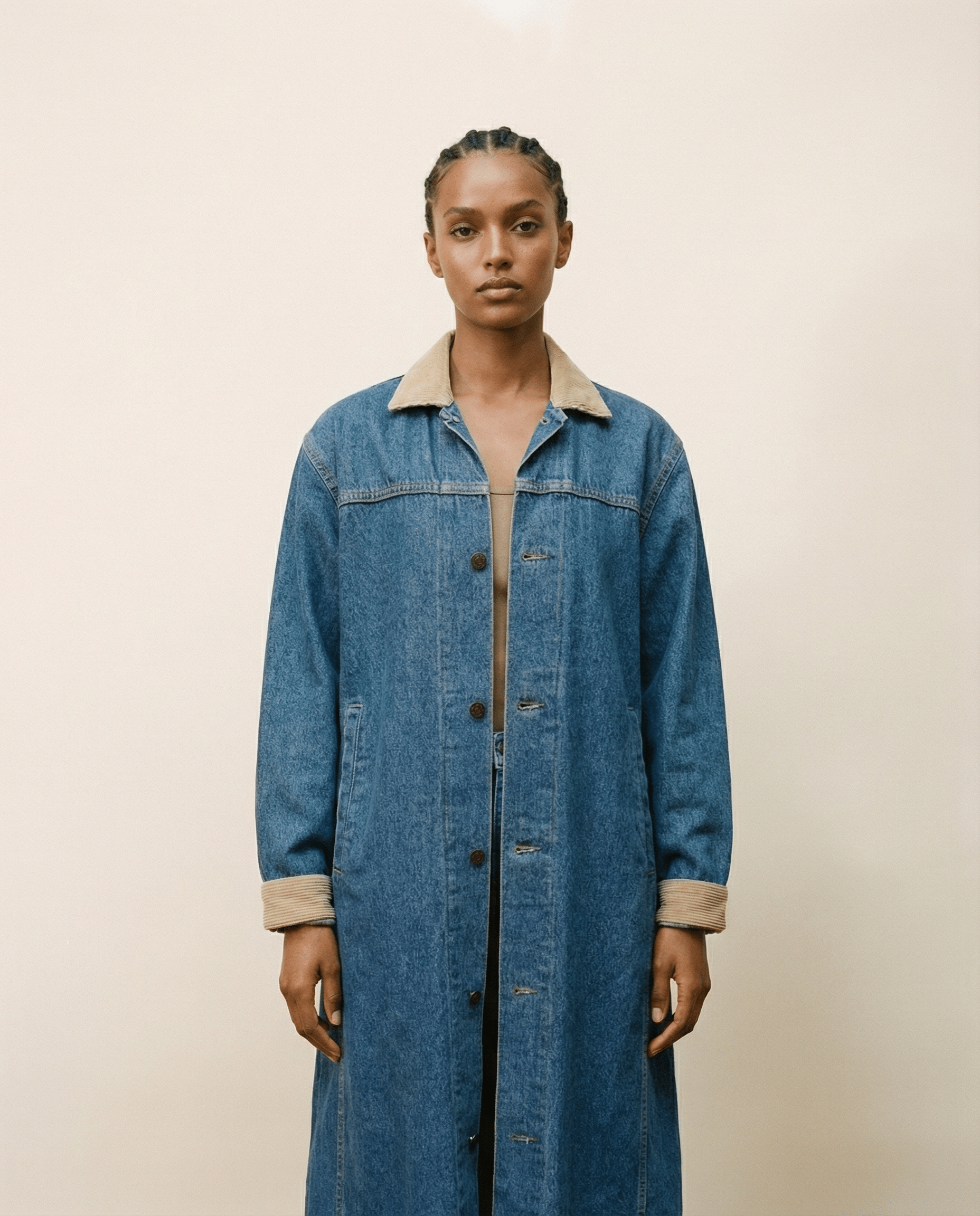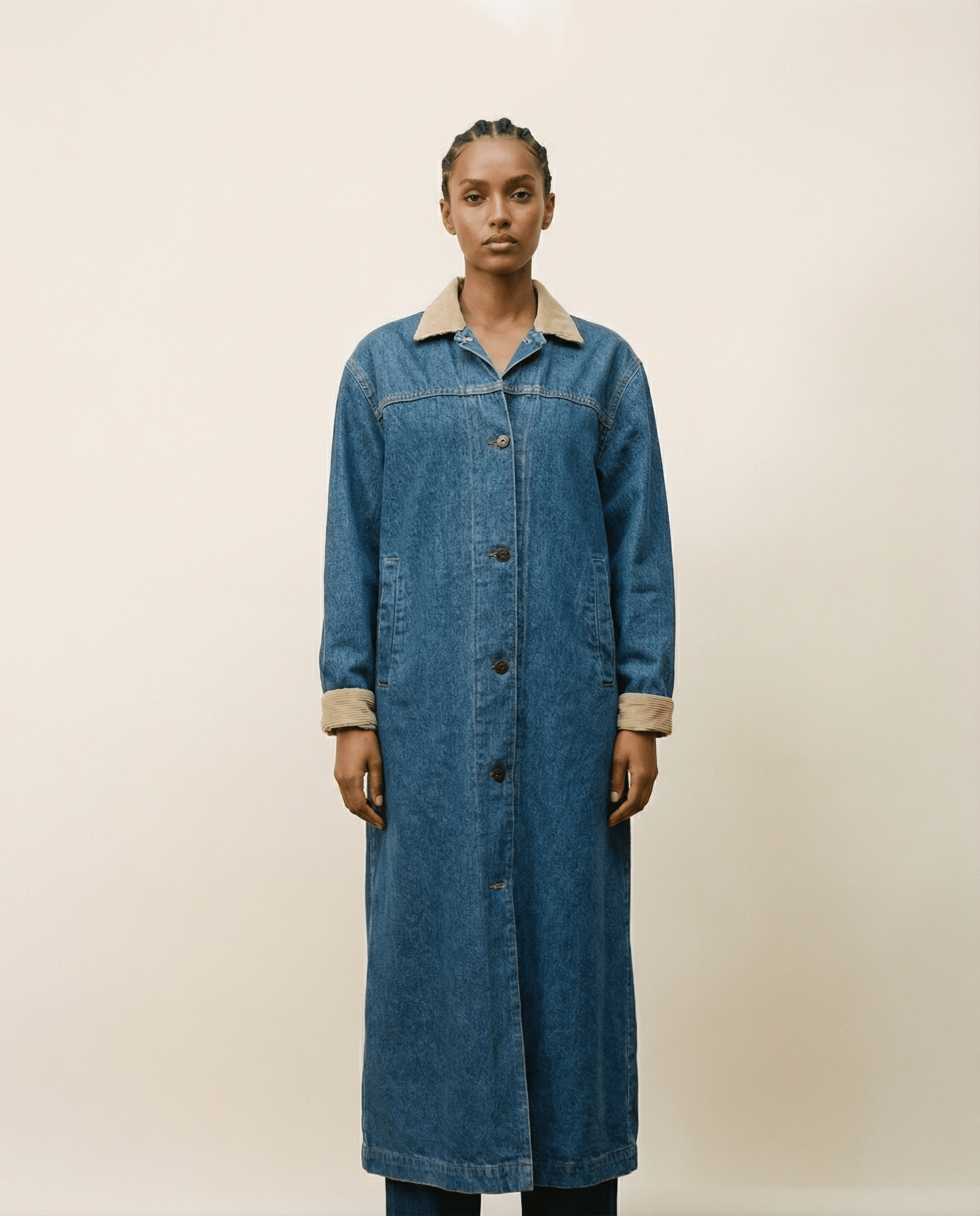 A true American classic. This vintage Levi’s long denim duster is the kind of piece that earns character with every season. Cut in a full-length silhouette and finished with a soft tan corduroy collar and cuffs, it blends utility and western heritage with effortless style.