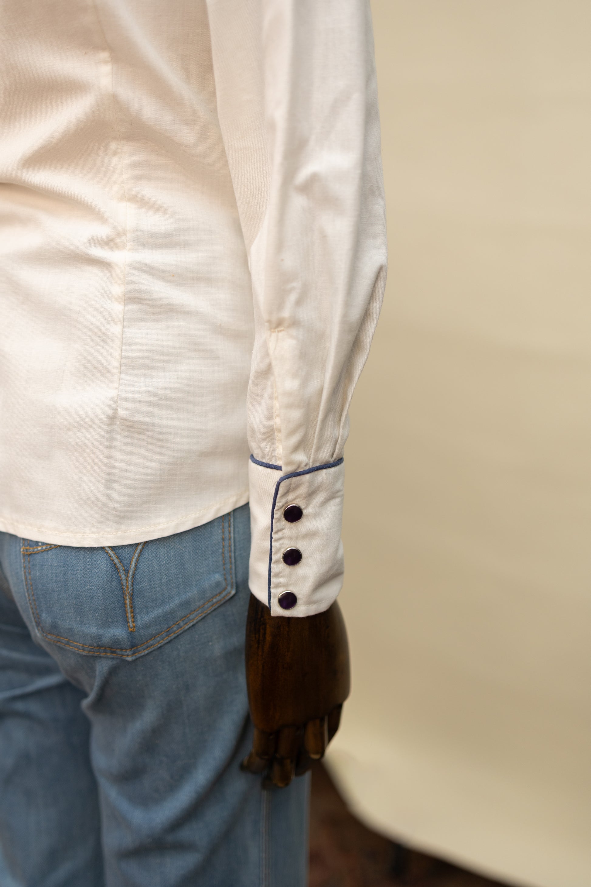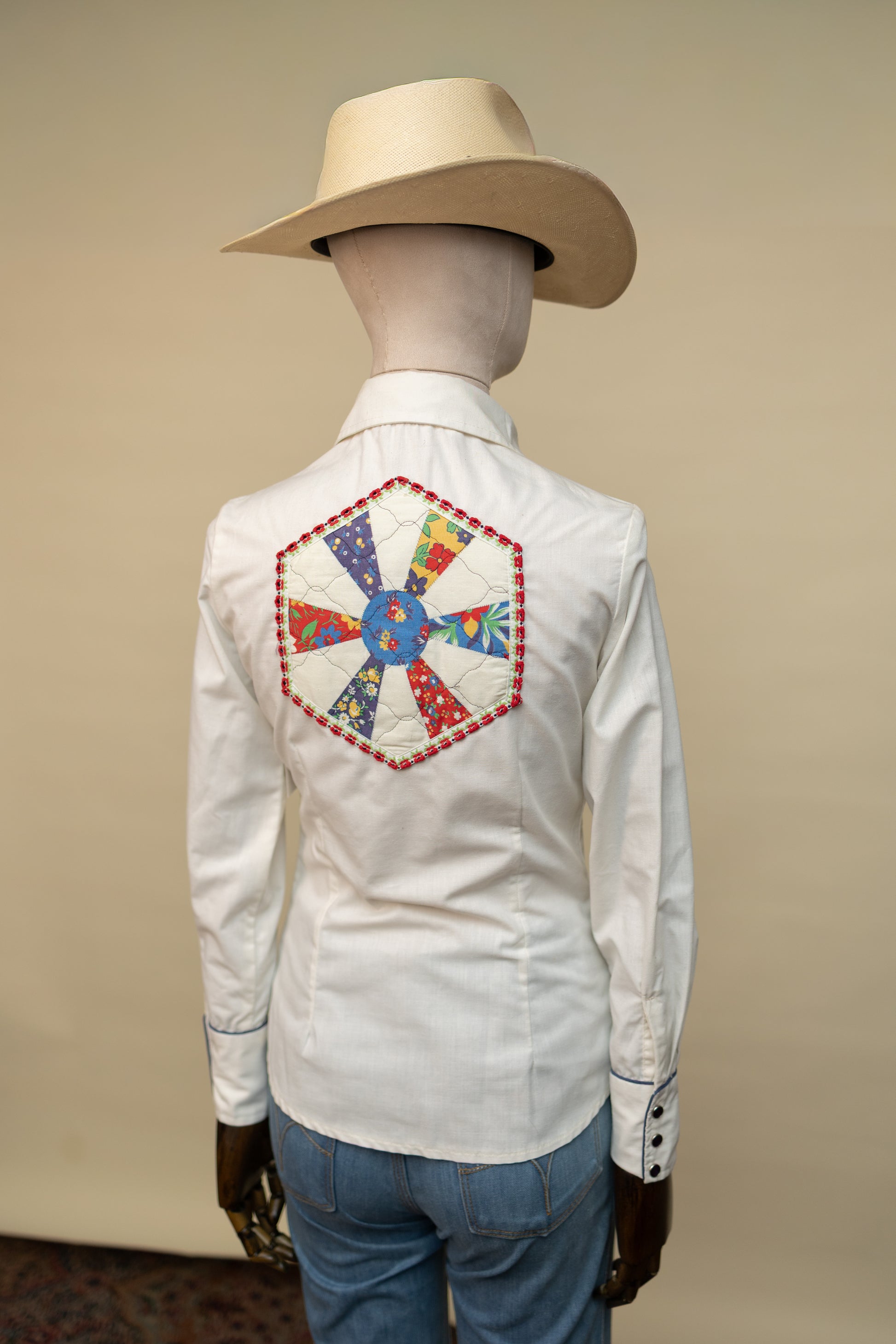 The crisp ivory cotton base is finished with navy piping, purple pearl snap buttons, and tailored seams for a flattering, feminine fit. The back showcases a striking patchwork sunburst medallion — a true ode to American craft and countryside style.