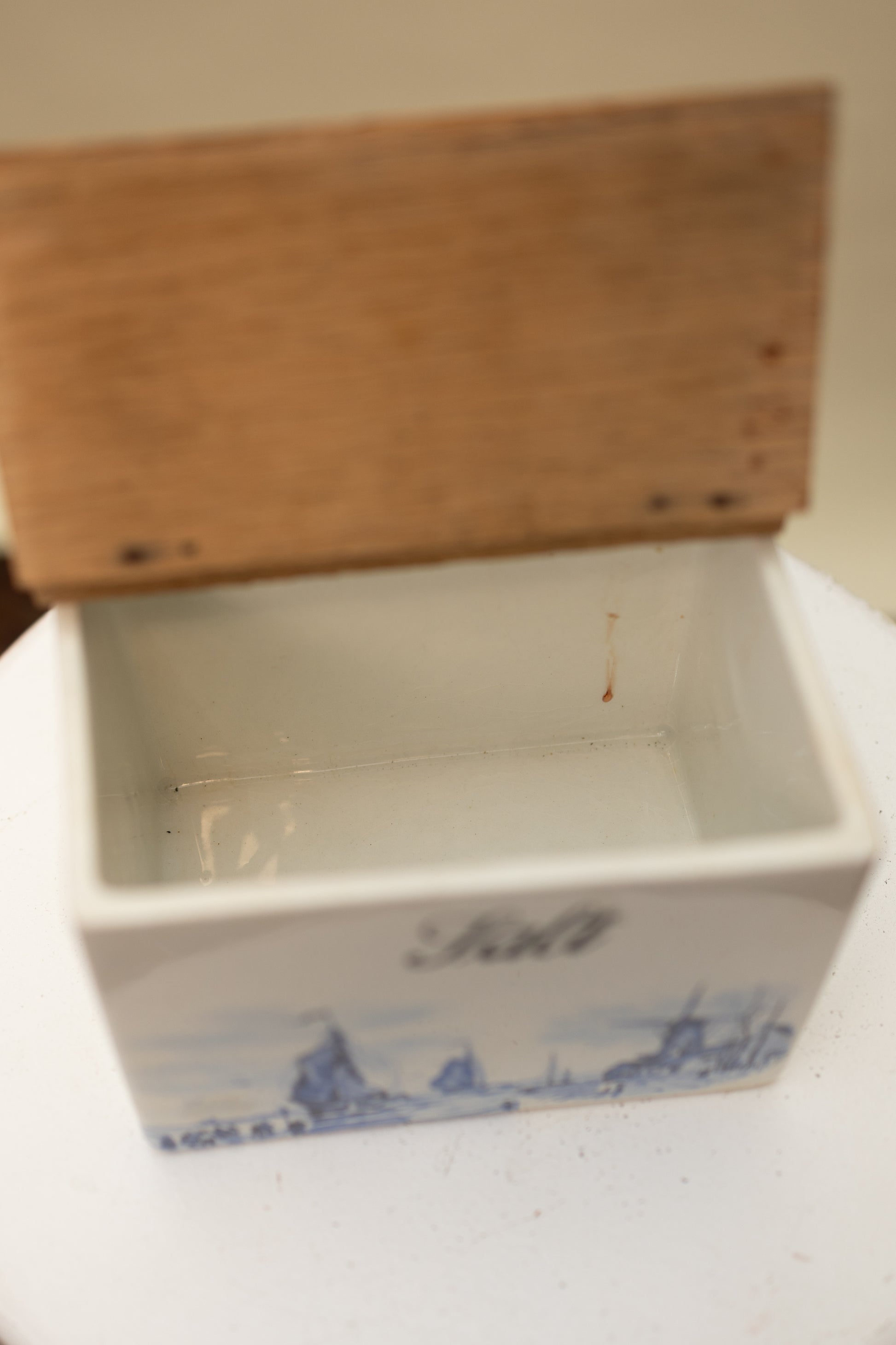 Bring a touch of European charm into your kitchen with this vintage Delft blue ceramic spice and salt set. Hand-painted with classic windmills, sailboats, and Dutch countryside scenes, this set includes a wall-mounted salt box with a wooden lid and a matching spice rack featuring labeled drawers for Paprika, Pepper, Salt, Allspice, Cinnamon, and Cloves.