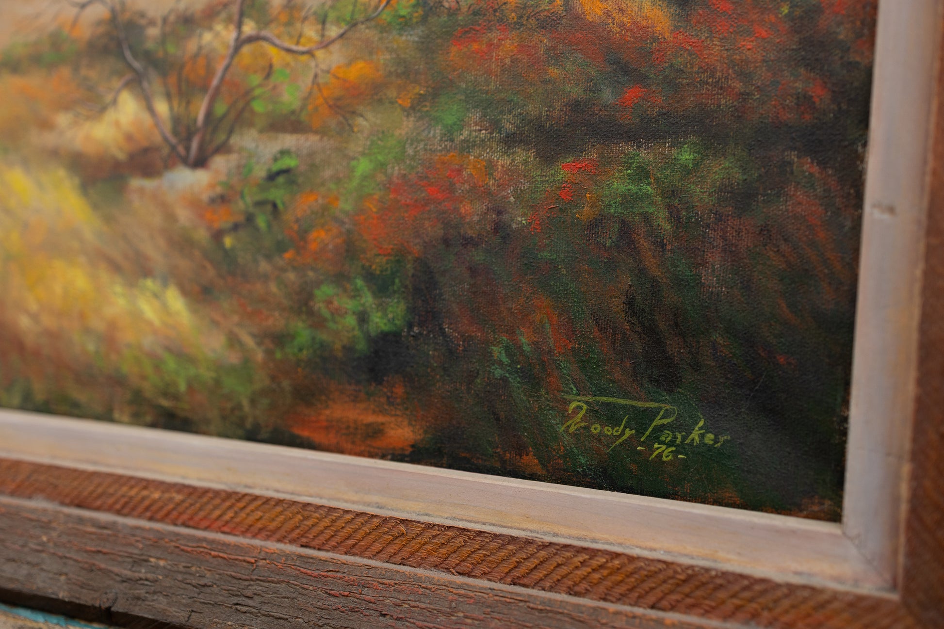 A richly detailed original oil painting capturing a weathered barn set against an autumn countryside. Warm rusty reds, golden fields, and deep green foliage create a sense of nostalgia and calm, while the textured brushwork brings the scene to life. Signed in the lower right corner by artist Woody Parker and dated ’76.